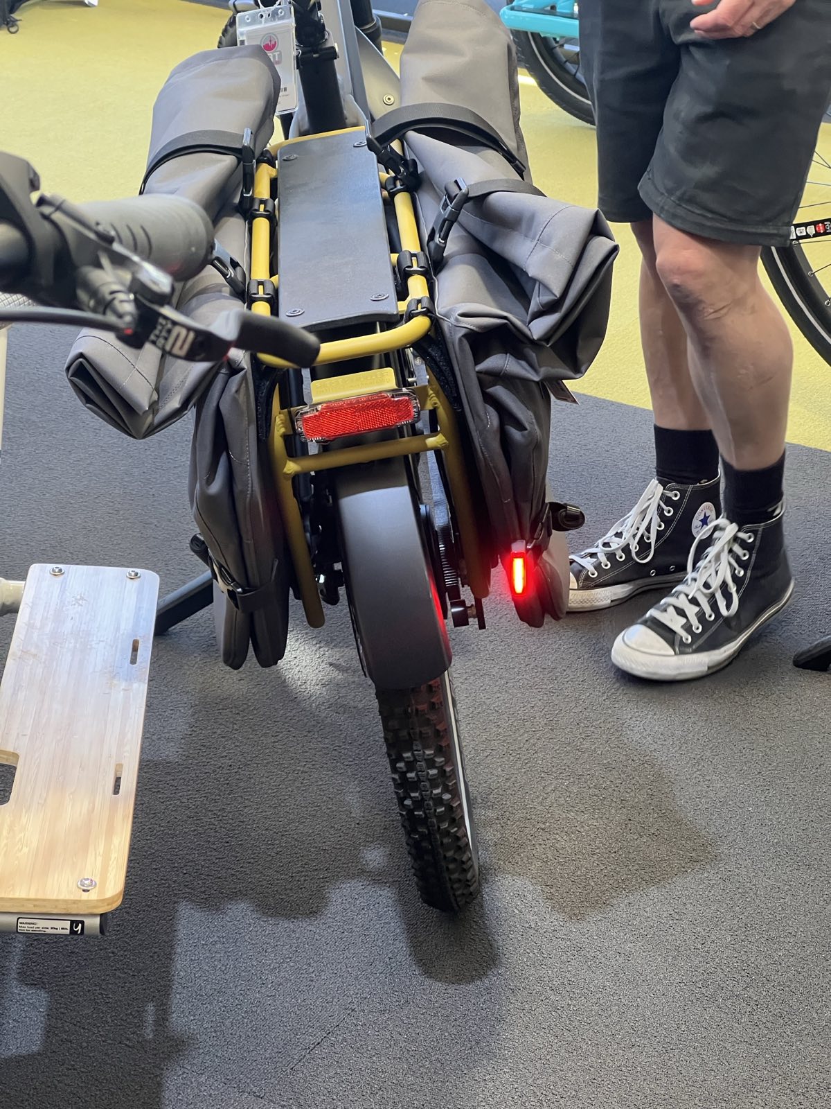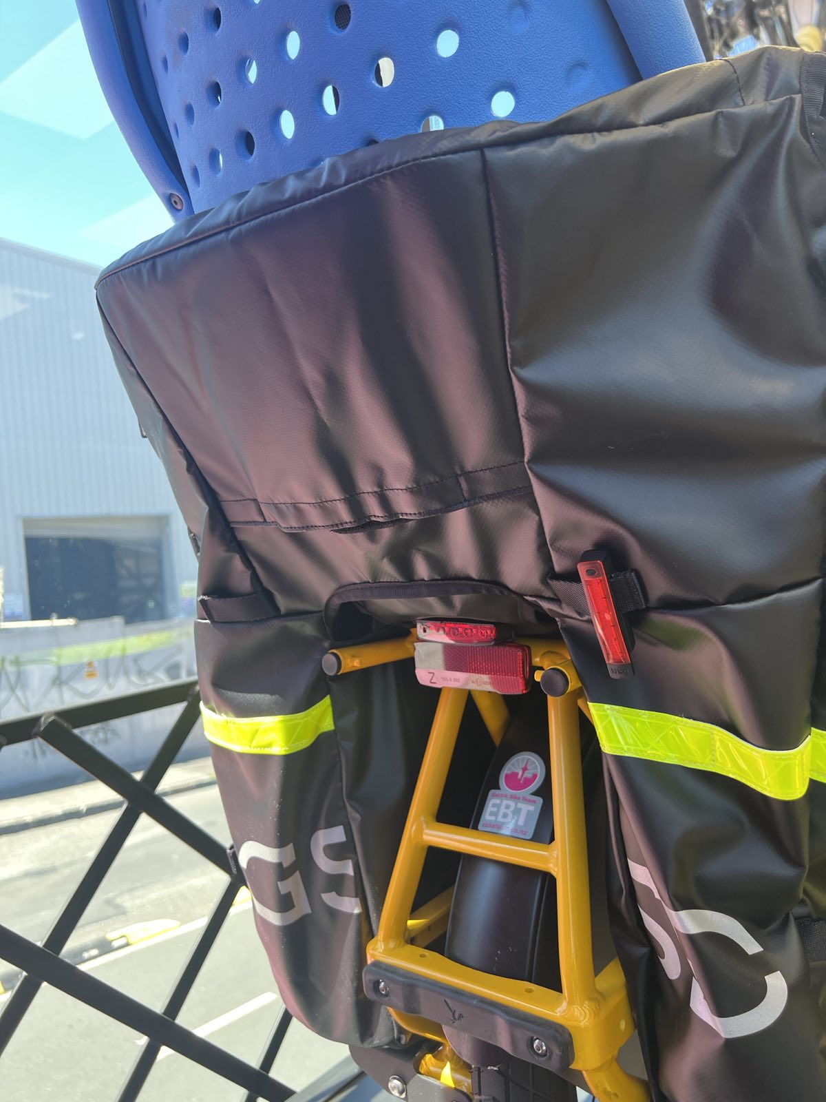 Rechargeable and compact rear (red) bike light. This is one of the most versatile we could find, suitable not just for the back of your e-bike but often for your helmet or back of child seat and other cargo bike accessories.
